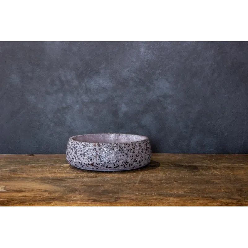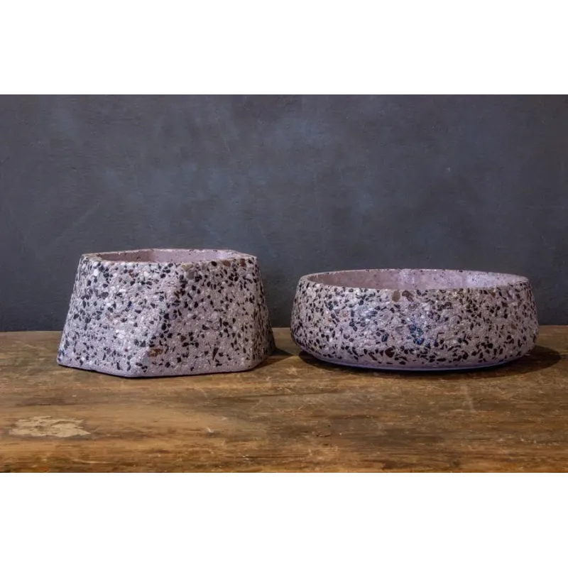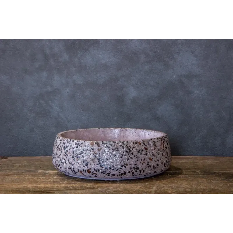 Efekt terrazzo z marmurem – Włoskie kruszywo zatopione w pudrowym betonie tworzy delikatny, a zarazem oryginalny wzór. Każdy egzemplarz jest nieco inny, co dodaje mu wyjątkowości.