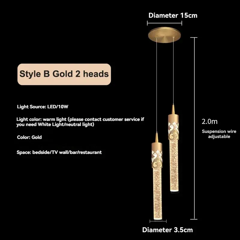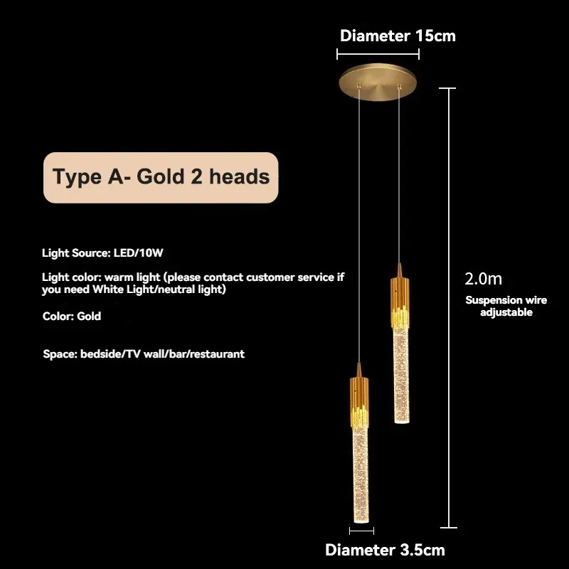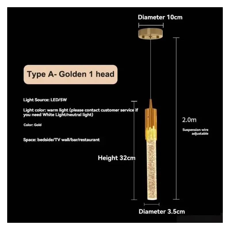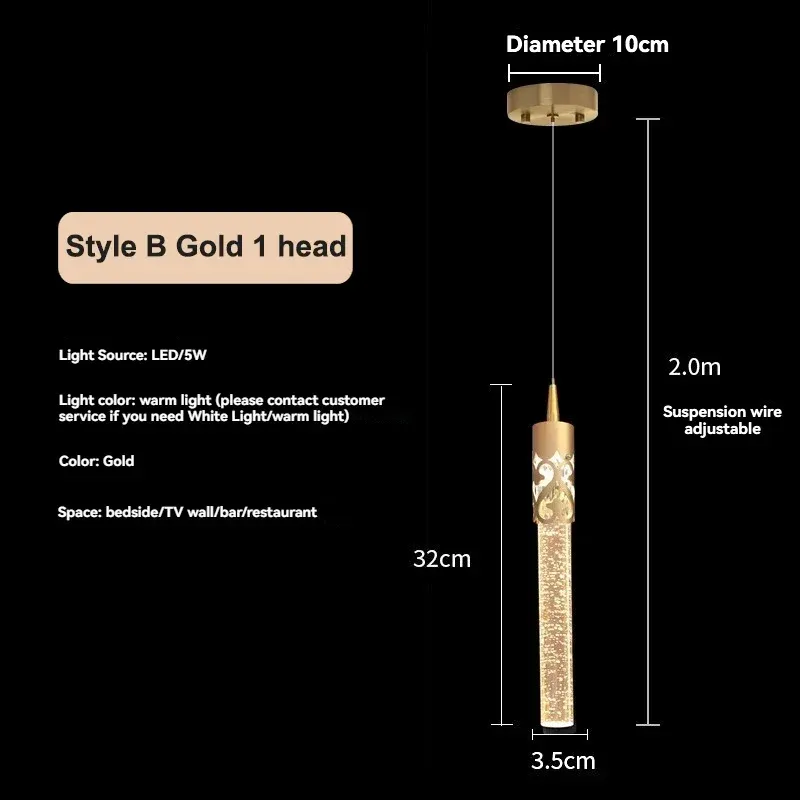 - Źródło światła: LED (w zestawie) - Moc: 5W/10W - Wymiary: Średnica 3.5 cm, wysokość 33 cm (typ A), wysokość 2 m (długość kabla) - Materiał: Aluminium z malowaniem - Zasilanie: AC 220V - Typ montażu: Zawieszenie na kablu - Certyfikaty: CE, CCC, RoHS - Zastosowanie: Salon, sypialnia, biuro, hotel, pokój dzienny
