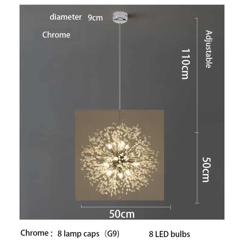 - Materiał: Korpus z żelaza, wykończenie w chromie, kryształowe detale - Styl: Nowoczesny, w stylu duńskim - Certyfikaty: CCC, LVD, VDE - Źródło światła: LED, żarówki G9 (w zestawie) - Kierunek światła: Góra i dół - Napięcie: 220V - Mocowanie: Do samodzielnego montażu - Wykończenie: Polerowany chrom - Zastosowanie: Salon, jadalnia, nowoczesne wnętrza - Gwarancja: 1 rok